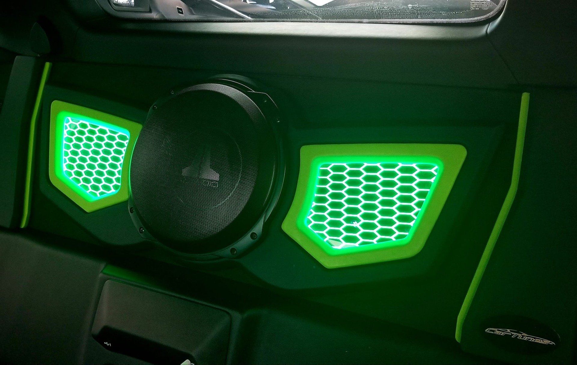 We added a JL Audio RD Series amplifier and a 10TW3 thin mount subwoofer in a custom fabricated sub enclosure with laser etched/lighted panels.